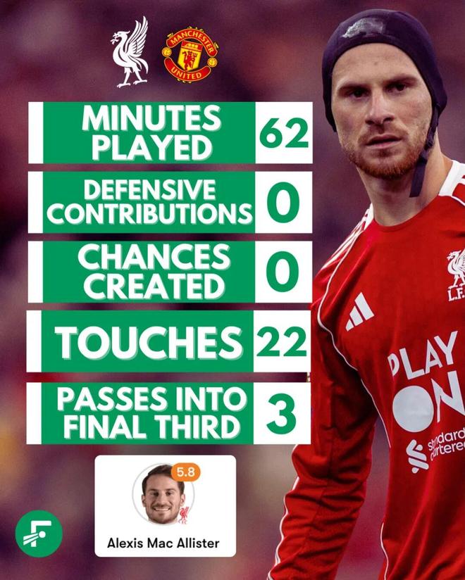 但在2025/26赛季,麦卡利斯特的发挥形同梦游。对阵曼联,他踢了62多分钟,仅22次触球、13脚传球、6次丢失球权——对一名中场核心来说,数字触目惊心。更让人咋舌的是,他0对抗成功,迅速成为众矢之的。一位利物浦博主在X上直言他是“队里最被高估的球员”,“在禁区到禁区之间慢得像快40岁的球员”。