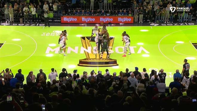 本场比赛,森林狼队按照杯赛规定将自己的主场地板换成了NBA杯的专属场地。森林狼队也采用了球队的一大主配色亮绿色,但是这一颜色的选择似乎对于观众的视觉感受并不友好,仅通过图片都能感受到亮绿色对于视力感官的刺激。甚至场上身穿白色队服的爵士球员都淹没在了这片绿色的场地中。
