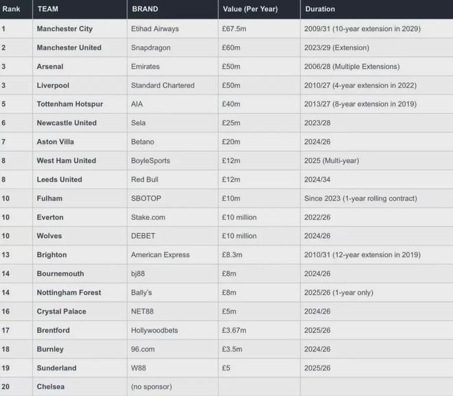 2025-26赛季英超胸前广告赞助情况一览