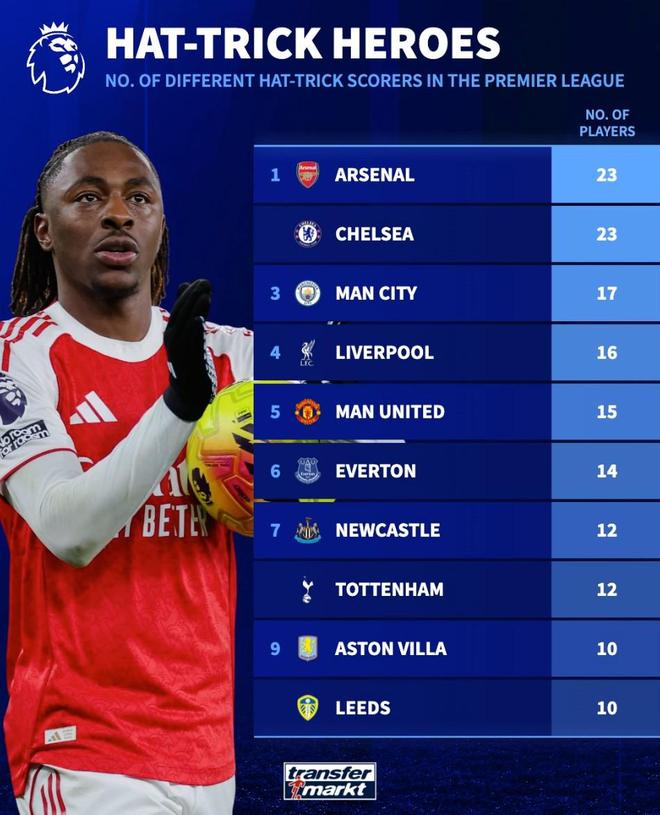 英超历史戴帽球员数量前10球队:阿森纳、切尔西23人居首
