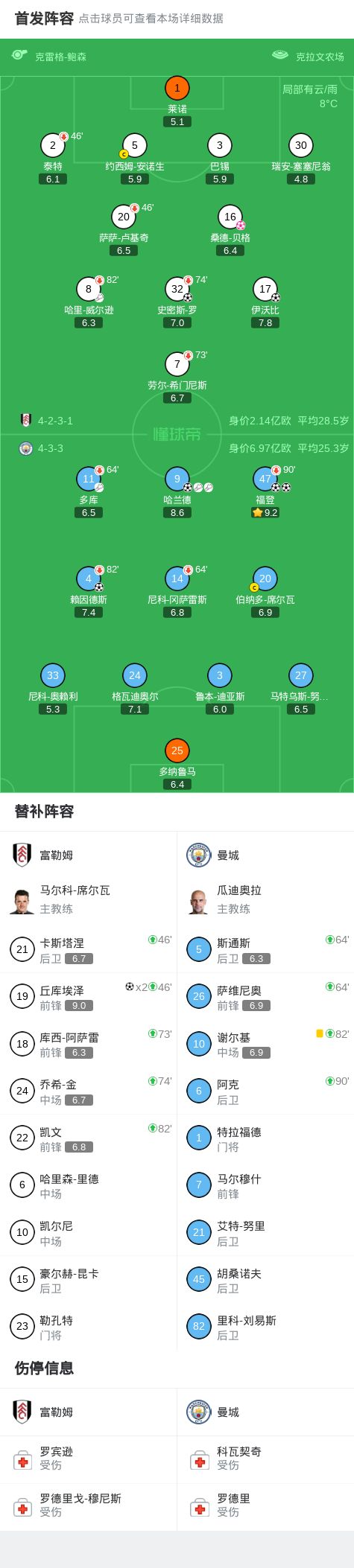 北京时间12月3日,2025-2026赛季英格兰足球超级联赛第14轮展开较量,富勒姆坐镇主场迎战曼城。上半场,多库送出助攻,哈兰德破门为曼城先拔头筹;随后哈兰德送出精准传球,赖因德斯接球后冷静施射得手;紧接着福登远射建功,进一步扩大领先优势;临近上半场结束,哈里-威尔逊传中精准,史密斯-罗抢点破门,为主队扳回一城。下半场易边再战,哈兰德再次展现个人能力,助攻福登推射入网;不久后桑德-贝格不慎将球打入自家球门,曼城继续扩大比分;富勒姆随即发起反击,伊沃比抓住机会完成破门;此后丘库埃泽连续两次在进攻中取得成效,先是低射破网,随后再度抢点得手,将场上比分多次拉近。最终全场比赛结束,富勒姆以4比5惜败于曼城。