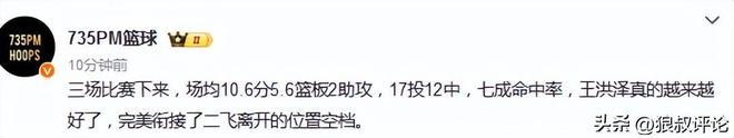 过去3场CBA杯赛,王洪泽,场均10.6分5.6篮板2助攻,17投12中,七成命中率,王洪泽真的越来越好了,完美衔接了二飞离开的位置空档。