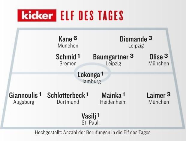 - 德甲 | 踢球者评德甲本轮最佳阵容:凯恩、奥利塞、莱默尔等人在列