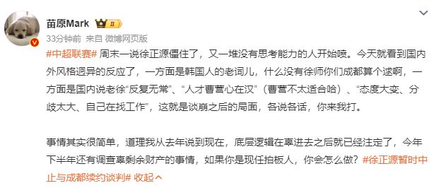 在《体坛周报》透露徐正源暂停续约谈判之后,媒体人苗原分析,“ 熟悉蓉城俱乐部打法的其实早就有预判,谈判每一次不顺利,锅必须要扣韩国人的头上,韩国那边也有预判,今天几个媒体已经独家在聊徐正源续约有麻烦,并再次细数他对中国足球的贡献,以及成都球迷如何殷切地希望他能够留下来。”