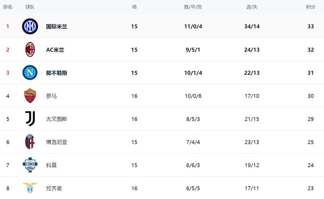 在积分榜上,国际米兰排名榜首。国际米兰11胜4负,拿到33分。排名第2的是AC米兰。AC米兰9胜5平1负,拿到32分,只比国际米兰少1分。第3名的是那不勒斯,拿到31分。输球的罗马依然是30分,排名第4。尤文图斯赢球之后,总积分达到29分,排名第5,只比罗马少1分,下一轮有可能杀入欧冠区。博洛尼亚以25分排名第6。法布雷加斯率领的科莫以24分排名第7。拉齐奥23分排名第8。