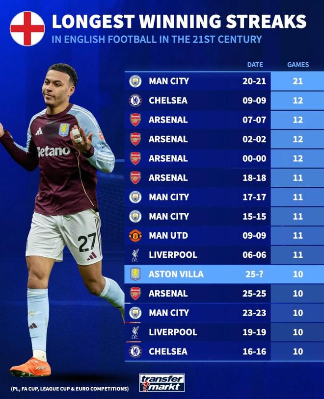 北京时间12月23日,德转统计出了本世纪英超俱乐部各项赛事的连胜纪录,曼城以21连胜高居第一,刚刚豪取10连胜的阿斯顿维拉则取得了英超俱乐部历史并列第四长的连胜纪录。
