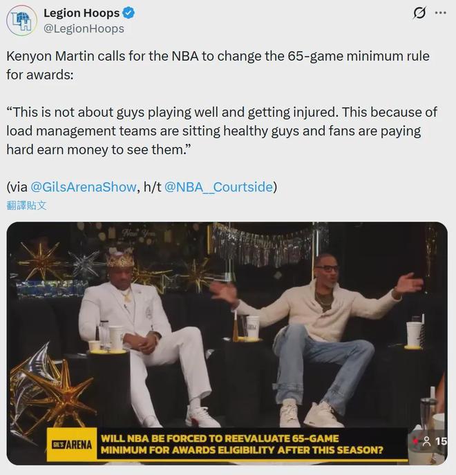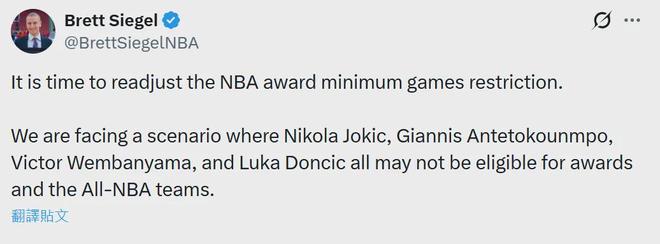 NBA名记Brett Siegel更是直抒胸臆:“是时候调整NBA奖项的最低出场次数限制了。目前约基奇、字母哥、文班亚马和东契奇等球星都可能因未达到出场次数要求而无法获得奖项及入选最佳阵容。”