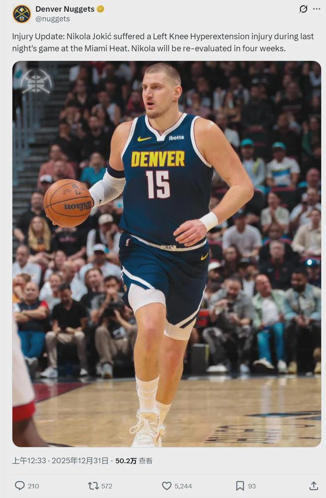 今天的最新消息,还是由美国篮球名记Shams报道,约基奇出现了左膝过度伸展的情况,至少伤停4周。掘金随后官宣确认了这件事。