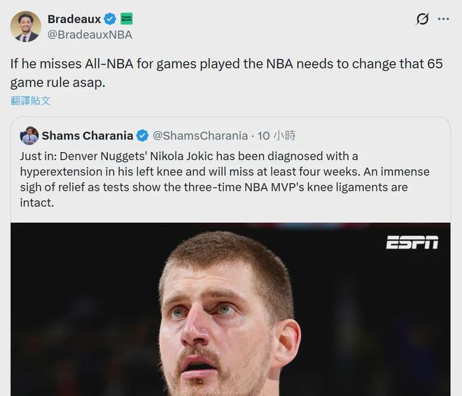 美国的火箭自媒体人Bradeaux也是声援约基奇:“如果约基奇因出战场次而没能入选最佳阵容,那么NBA需要尽快改变65场的规定。”