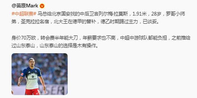 莫斯与汉堡的合同将于本赛季结束后到期,转会费将为10万欧元。目前德转身价为70万欧元。该媒体称,国安已要求拉莫斯周二在汉堡完成了体检。德甲保级队替补,踢中超够用了!有球迷调侃:“转会费便宜,不会有大坑吧!”“这可是方昊留下的转会费啊。”“方昊换个中卫外援,合适。”