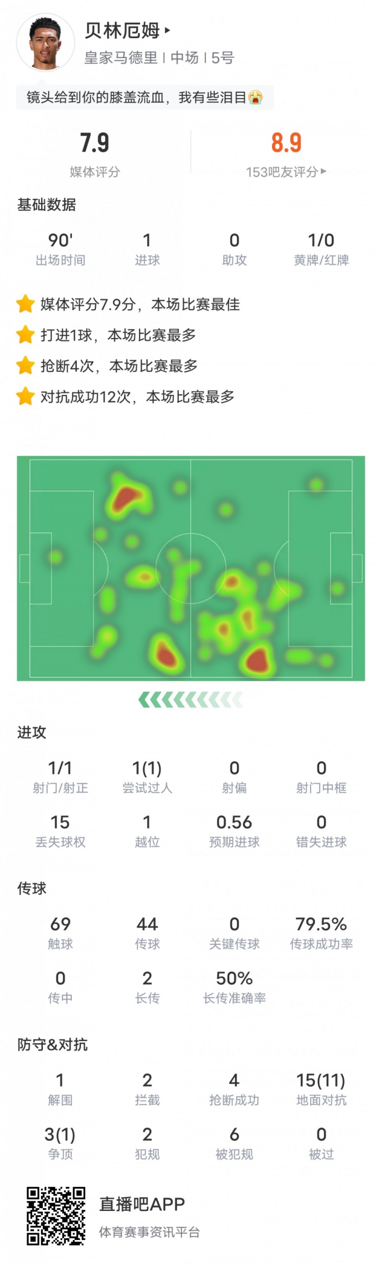 贝林厄姆本场数据:1进球1过人成功6次被犯规,评分7.9