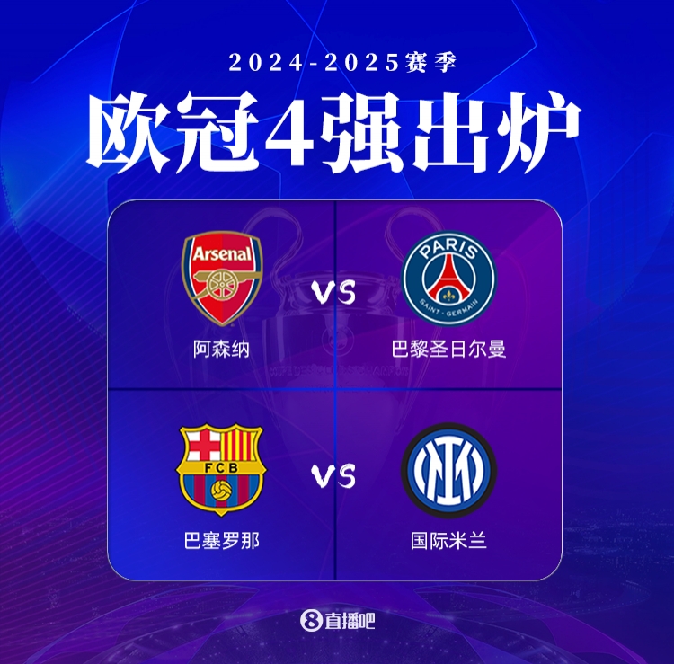 4月17日宣 欧冠1/4决赛次回合结束,四强全部出炉:阿森纳、巴黎、巴萨、国米。